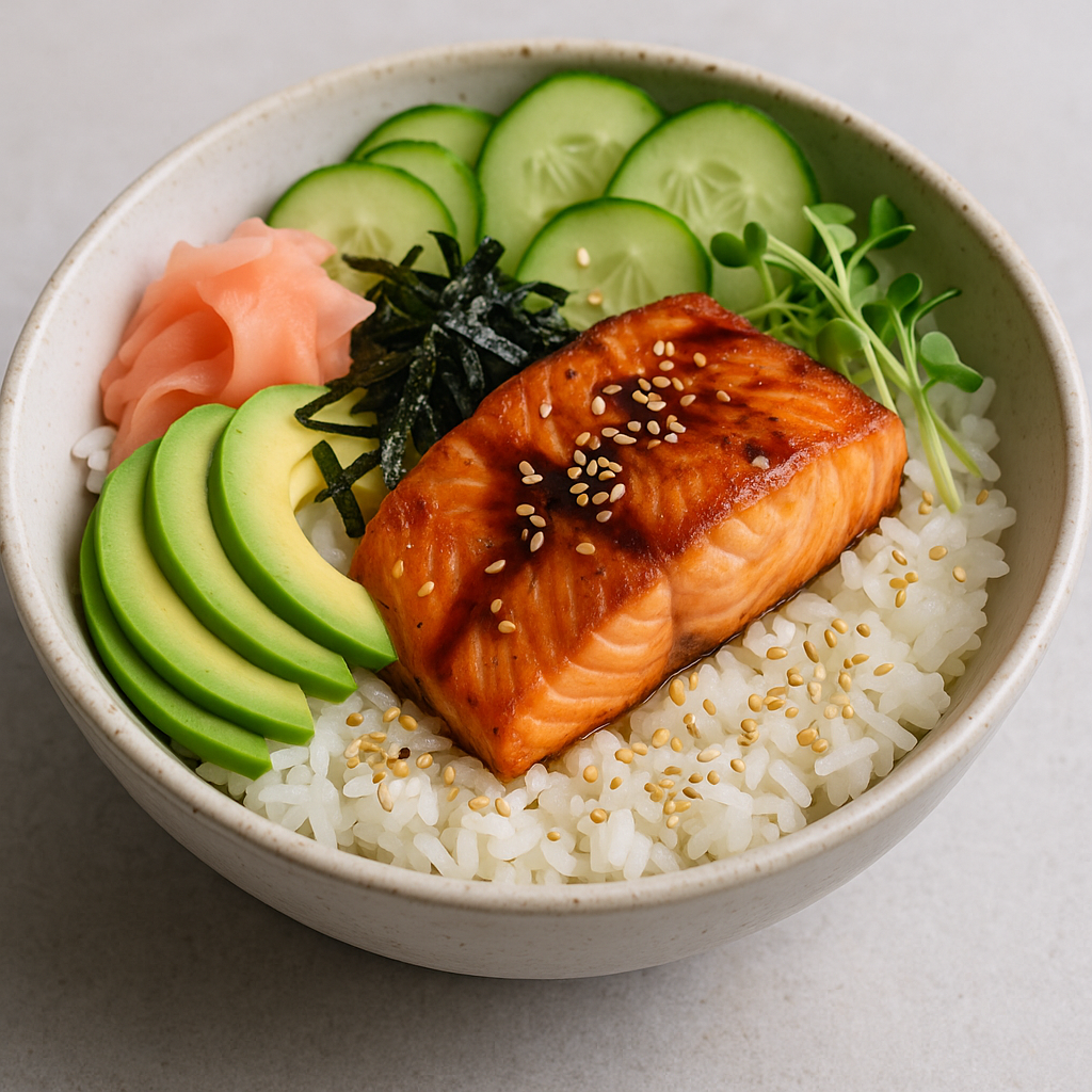 그릇에 따뜻한 밥을 넉넉히 담습니다. 그 위에 연어를 올리고 아보카도, 오이, 초생강, 김 등을 보기 좋게 배치합니다. 간장을 살짝 뿌리고 볶은 참깨를 뿌려 마무리합니다. - 개인 취향으로 커스터마이징